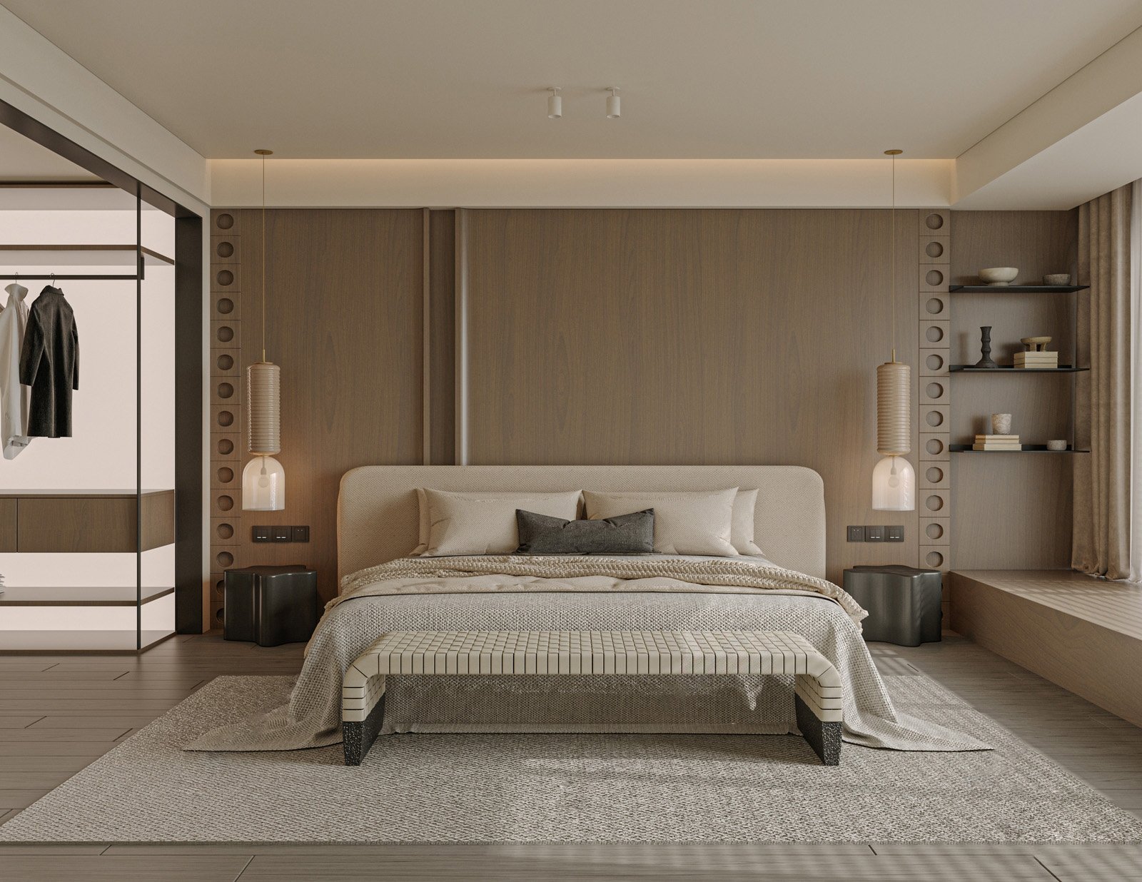 现代卧室 床具 带衣帽间 吊灯 床尾凳 ID:193019