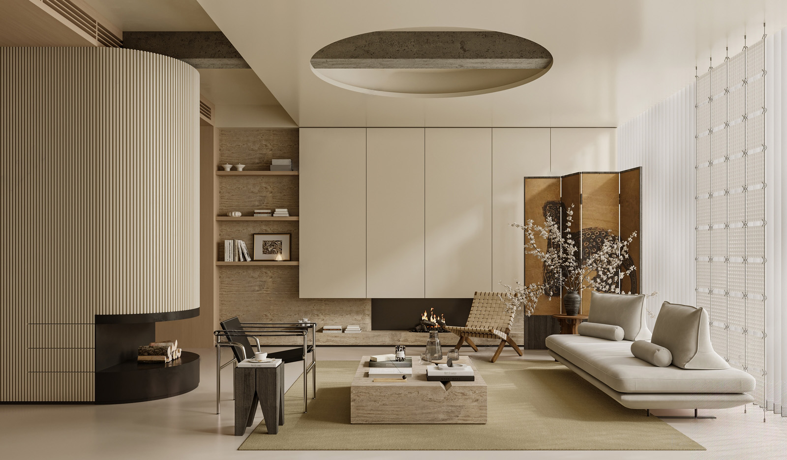 现代客厅 沙发 单椅 书架 饰品 无主灯
