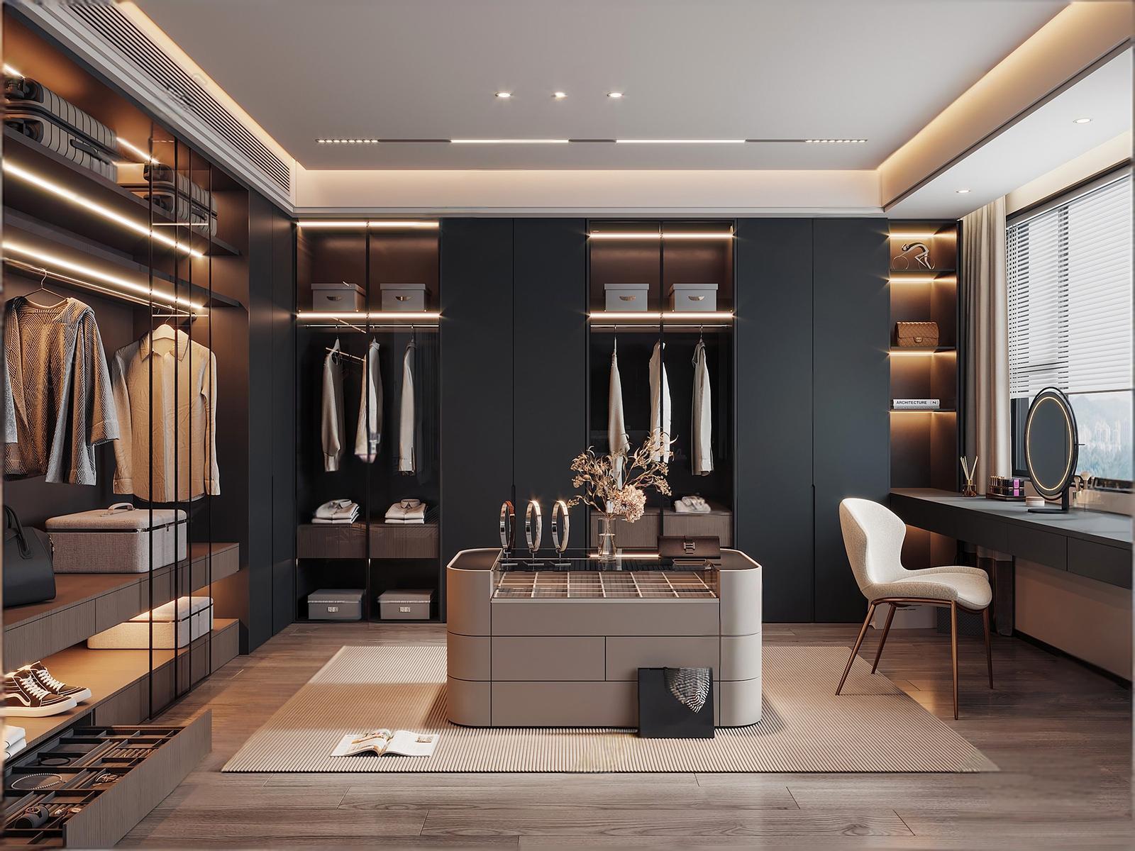 现代轻奢衣帽间 开放式衣帽间 岛台衣帽间 步入式衣帽间 梳妆台 服饰包包 ID:191305